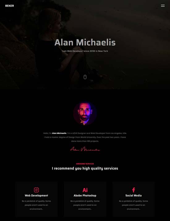 The HTML template of Beker Personal Portfolio is intended for many purposes. Information technology'southward a artistic, minimal and sleek blueprint. Information technology has all the features of the company'south website. Information technology is suitable for all beginning-ups, companies, agencies and freelancers, who need a professional person manner to present their projects and services with a 100% super responsive experience.