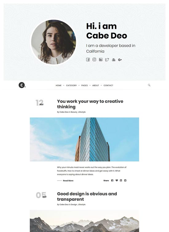 Cabe is a modern, minimal and clean personal blog template for all people who tell great stories and perfect for writers who need to create a personal weblog site. He has 20 dissimilar types of homepage. information technology'due south super unproblematic and functional, yous'll become a loftier-quality, responsive and well-designed blog for writers to focus solely on content writing, and its typography is perfect for your fans and followers to focus on each word that yous write.