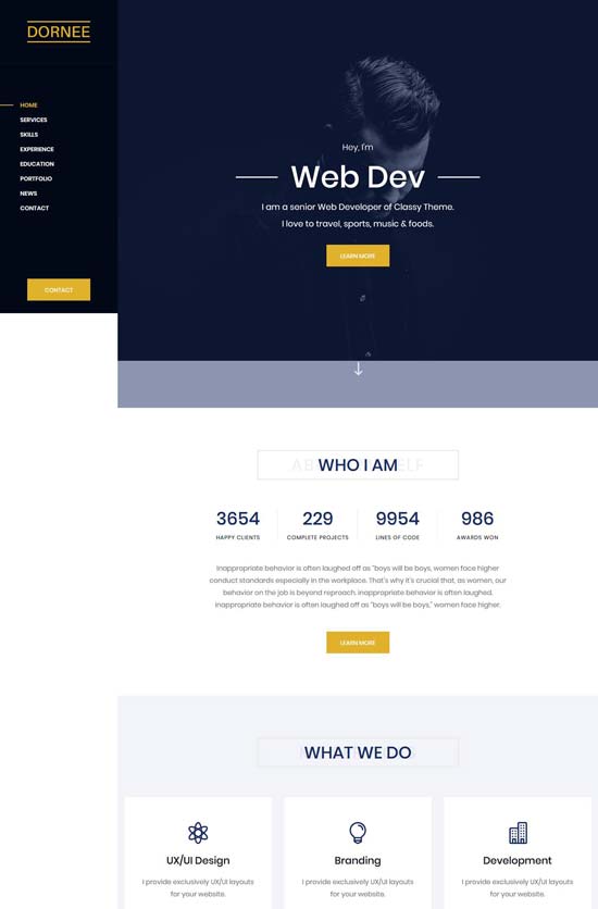 Dornee is a personal portfolio and resume template for your crawly website. Information technology gives you a convenient code and smart layouts. Information technology has all the features for your personal wallet sites. We create a dynamic contact form so that you can transfer your customer's email directly to your email address without any trouble. It has all the features for your new portfolio websites.