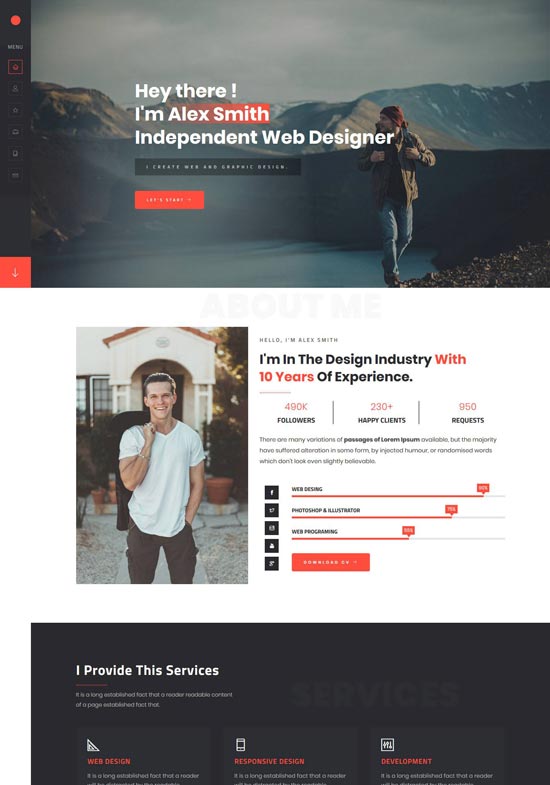 This is a modernistic personal template, creative, clean and professional. You can utilize this template for CVs, freelancers, illustrations, illustrations, and more to help you demonstrate all your services, information, and work. It has all the features for your personal wallet sites. All files and code were well organized and well documented, and you tin can apace and easily customize the template.